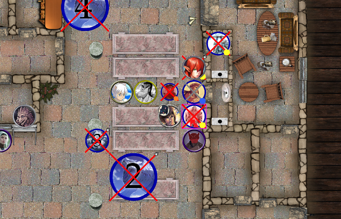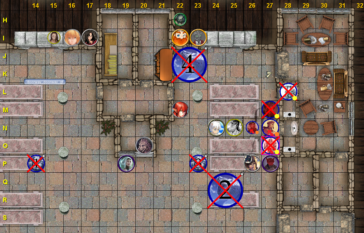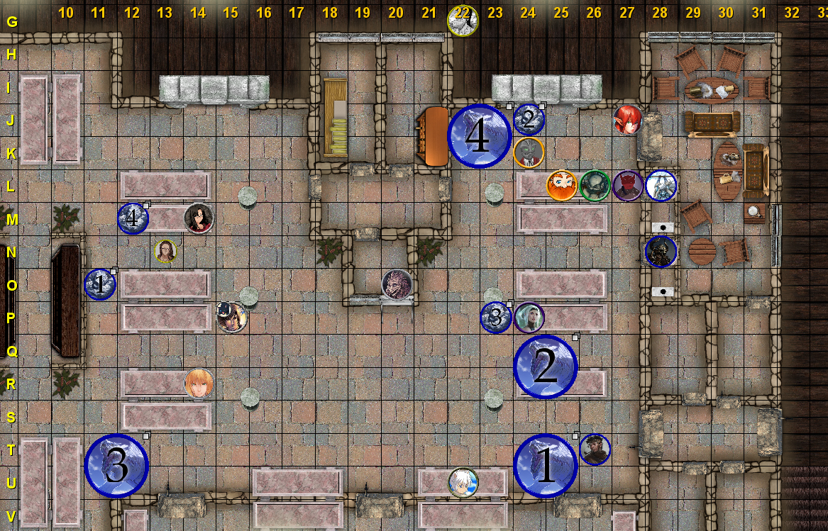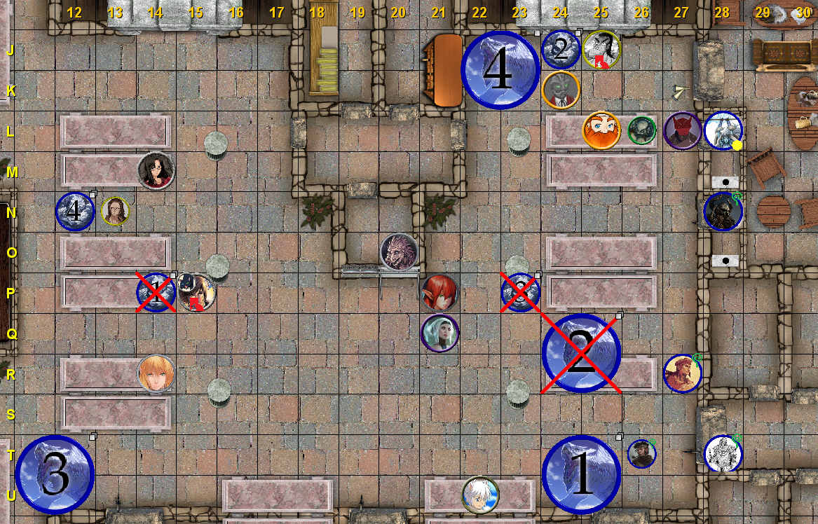 Plants spring to life beneath the hengeyokai's feet as the area is covered in thick foliage, concealing herself and her allies. One of the frost beasts lurches forward towards her and, in spite of her protection, manages to wound Sora before she disperses into a swarm of insects, reducing the damage. The various dragonmarked representatives scramble for the exits, except for Gardain and Cidri, who cower and try to protect themselves.