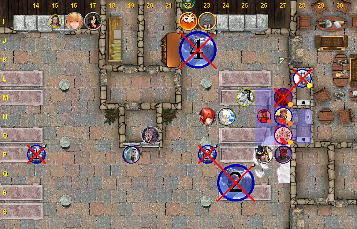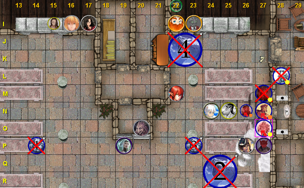 Garret shifts to N/14, Parthia moves to L/17, Raki moves to I/17, Cidri and Gardain take the total defense action, and the warforged shifts to K/25 before it uses Burning Weapons against Frost Beast 4, killing it and granting itself, Kuro and Melech an additional 3 fire damage to their melee and fire attacks