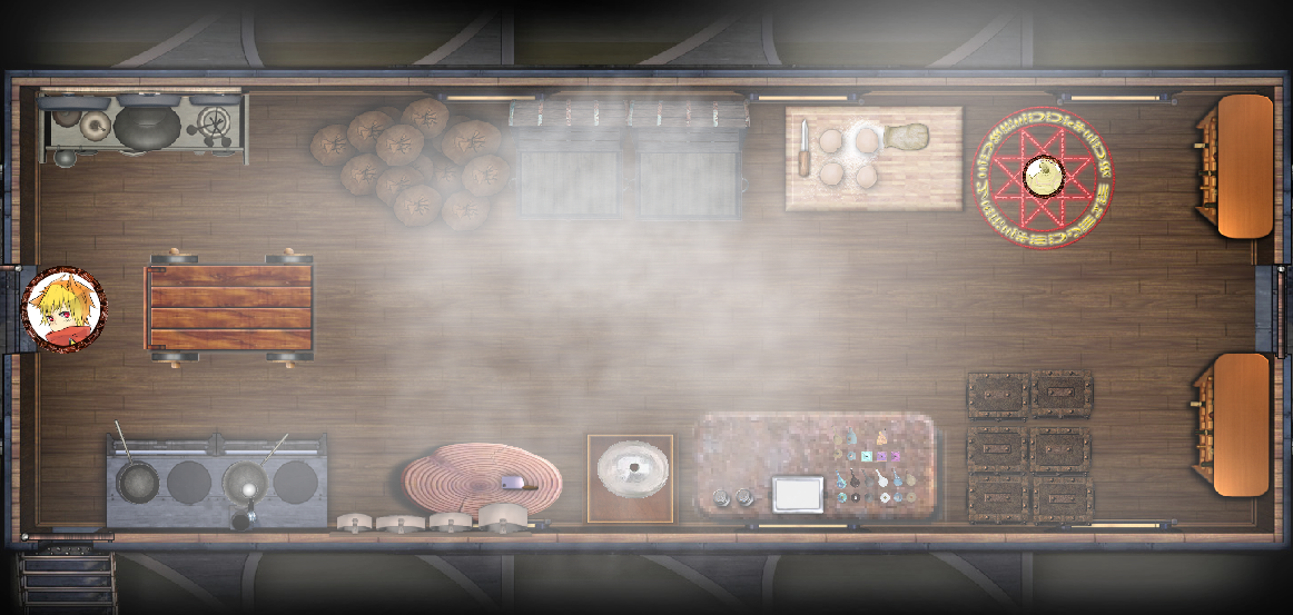 What's not normal are all the sacks of sugar and flour piled up by a pair of open boxes. The chilly fog seems to be billowing out from these chests, effectively cooling the entire room. Half a dozen metal crates sit in the back of the room, next to a table covered in potion bottles of unknown contents. What's easily most disturbing, however, is the large magic circle near the rear of the cart. Besides being a strange looking magic circle in what should be a dining car, there's a very tiny figure in the middle of it. It seems to be some kind of homunculus made of cookie dough, with chocolate chips for eyes. It's just sitting there for now, but her keen eyes can see it seems to be growing ever so very slowly over time, siphoning mass from the balls of dough on the nearby table. It's not doing anything, though. It's just sitting there, growing at a very slow pace.