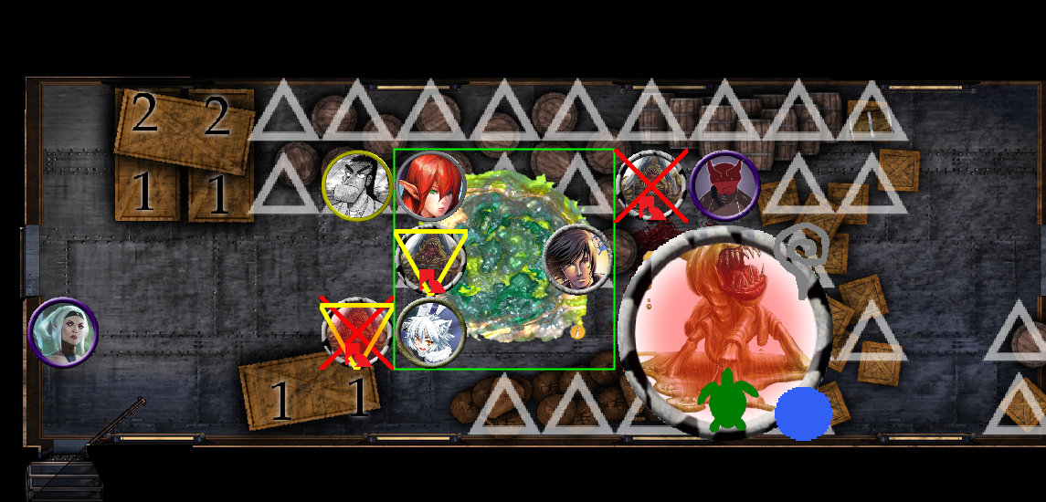 Sophie casts several hexes on the mimics, making sure that the largest one will be a greater threat to its allies than to hers. Trapped in an illusory maze of mirrors and unable to distinguish friend from foe, the composite mimic makes an attempt to bite at one of its allies, but misses completely, suffering from the paladin's burning mark. The mimic pays it no mind, its appendages bathing Kuro in acid that wounds him significantly. It suddenly begins to change into the form of a sturdy lockbox, its tendrils frozen in their grip on the warlord.