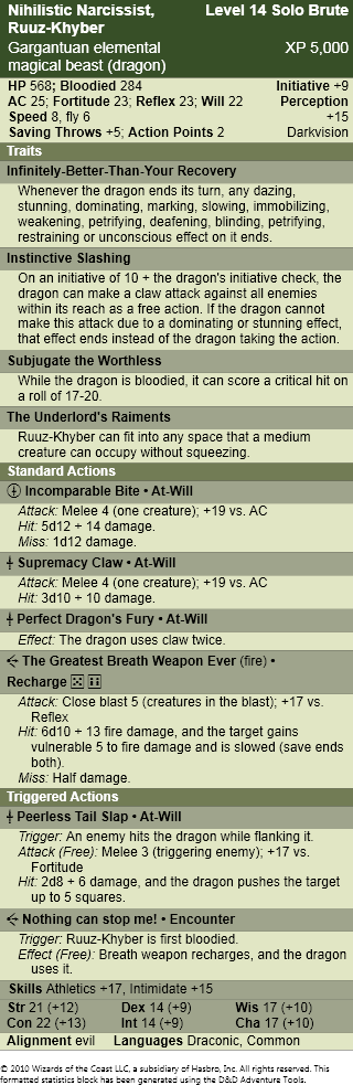 Once before the end of the encounter, a character within 3 squares of the rift can make an arcana check as a standard action with a DC of 27. A successful check will cause the rift to shrink, only affecting targets in its space and dealing half damage with its primary attack. In addition, performing this successfully causes Khyber to take a -2 penalty to attack rolls, damage rolls, and defenses until the end of the encounter. Failing this check results in the rift growing in size, and Khyber gaining a +2 power bonus to attack rolls, damage rolls, and defenses until the end of the encounter.
